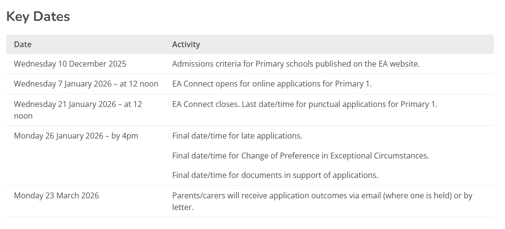 The Pre-School and Primary One online admissions portal opens on Wednesday 7th January 2026 at 12 noon and closes on Wednesday 21st January 2026 at 12 noon for applications for the academic year commencing September 2025. Admissions criteria will be available for each school on Wednesday 10th December 2025. Further information on the process is available on the EA Website. Click on the link below to find out more.